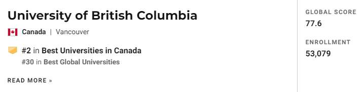2020年USNEWS 加拿大学校综合排名中,UBC位于第2名;世界大学排名中,UBC位于第30名。