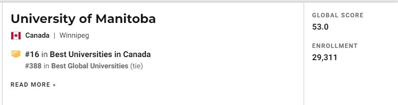 2020年USNEWS 加拿大学校排名中,曼尼托巴大学位于第16名。