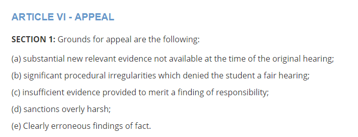 如果收到 南卫理公会大学 处分通知,学生可以在4个工作日内以书面的形式递交申诉(Appeal)。申诉的原因需满足以下一个或多个条件:
