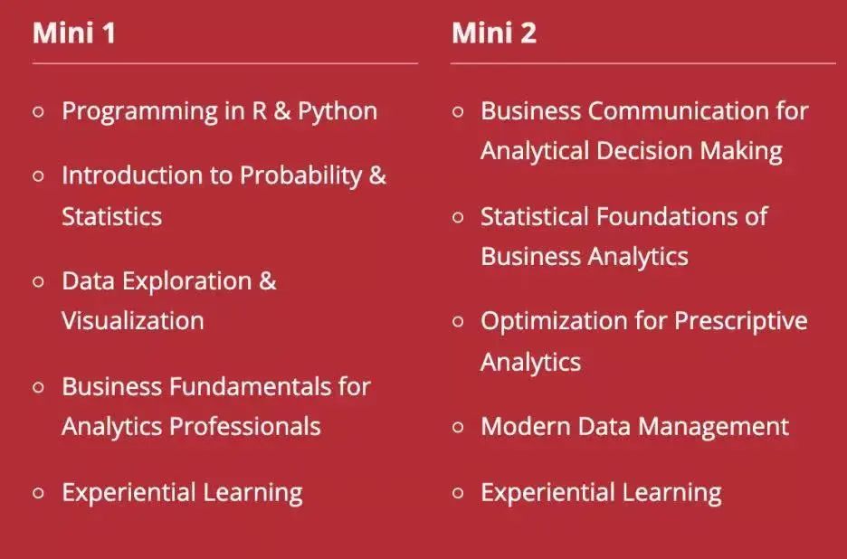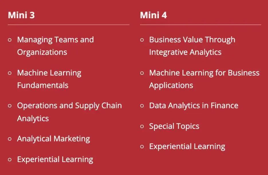 在课程设置方面,别看项目只有9个月,但Tepper是按照Mini来安排课程的,即一个学期有2个Mini,所以课程非常硬核,总共要学20门课。这个项目的培养目标,让学生能应用数据分析来应对商业中的挑战,并且有效且有说服力地将数据洞察与人沟通。
