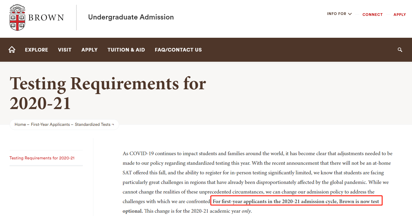 布朗大学指出,由于最近美国大学理事会(College Borad)宣布今年秋天将不再提供在家参加SAT考试的服务,以及目前学生报名参加现场考试的能力受到极大限制,学校认为,在受全球大流行病严重影响的地区,申请者们正面临着特别巨大的挑战。对此,学校决定改变招生政策——对于2020年秋季申请的这一批学生,布朗大学将采取“Test-Optional(考试可选)”政策。