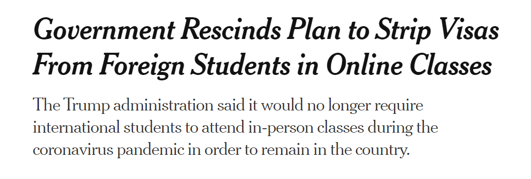 然而,这项「国际学生禁令」竟然在法院开庭之前被迅速撤销了,哈佛与MIT就这样奇妙的“不战而胜”。我们来看看怎么回事