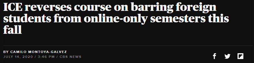 政府同意废除DHS和ICE“禁止上网课的国际学生留在美国”的限制。而根据CBS报道,ICE将恢复今年3月份发布的指导意见,允许国际学生持学生签证留在美国进行全网课学习。