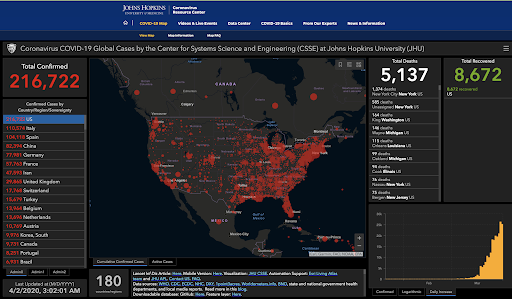 今天4月2号,照例先看一下约翰霍普金斯大学的疫情数字更新 (美东时间凌晨3点)。