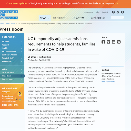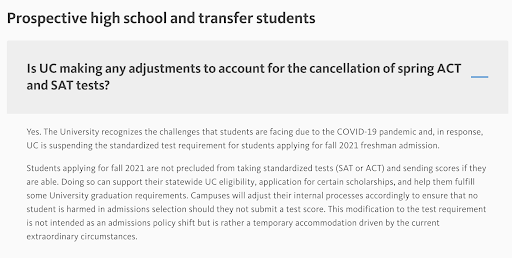 2020年2月3日,就是美国疫情发生之前,加大的教师委员会还向UC情愿,用一个加大的内部考试代替SAT和ACT。
