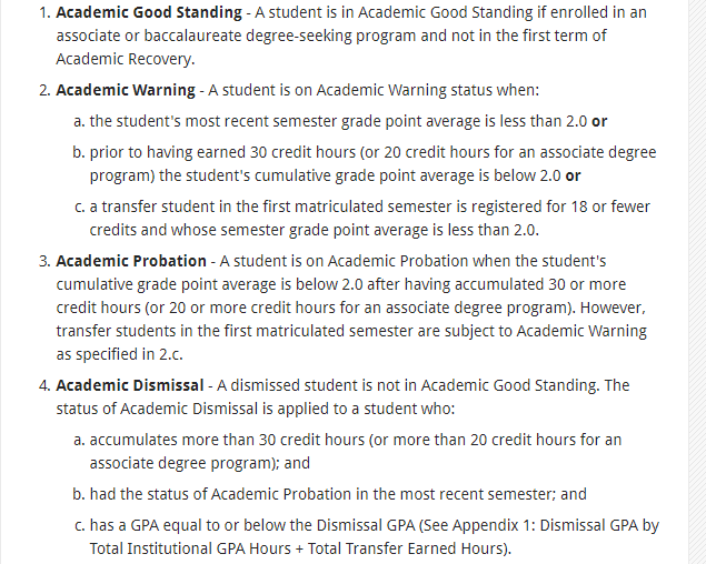 当学生修课累计超过30学分(或副学士学位课程超过20学分); 且在最近的一个学期中有被留校察看,GPA仍然不达标的话将会被学校开除(academic dismissal)。