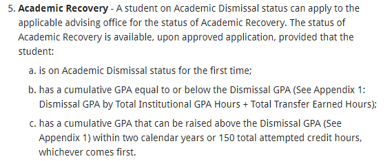 当因为成绩问题被学校开除,学生有两种选择恢复学业,一是四年后重新申请 天普大学 (Reinstatement),所有学分将会被评估;或者学生可以向学院申请选择下一个学期或夏季学期恢复学业(Academic Recovery ),通过申请的学生需要和advisor面谈制定学习计划,完成至少6个学分,并达到相应的GPA要求,才能返回天普。