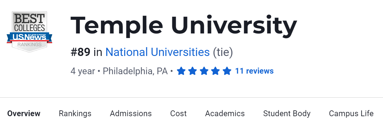 在2024年USNews美国大学排名中,天普大学排名第89。