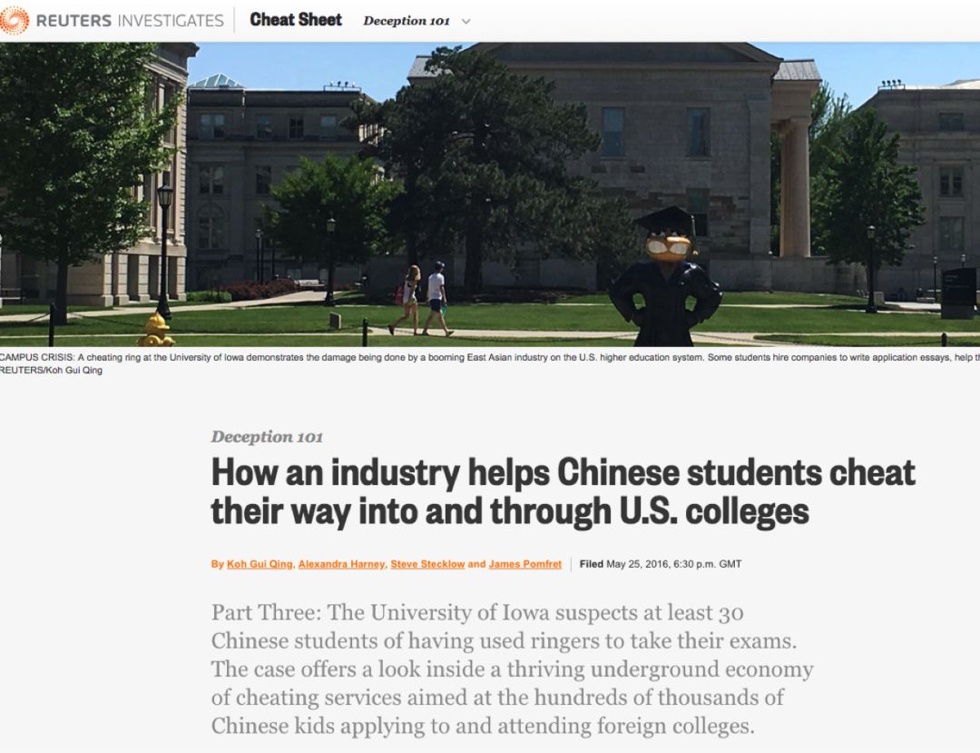 惊人的美国爱荷华大学的代考作弊案子中,当时一个代考的机构,就是学校的前中国学生会会长办的。出事以后,再也找不到。结果学生们都纷纷被开除了,非常令人痛心。
