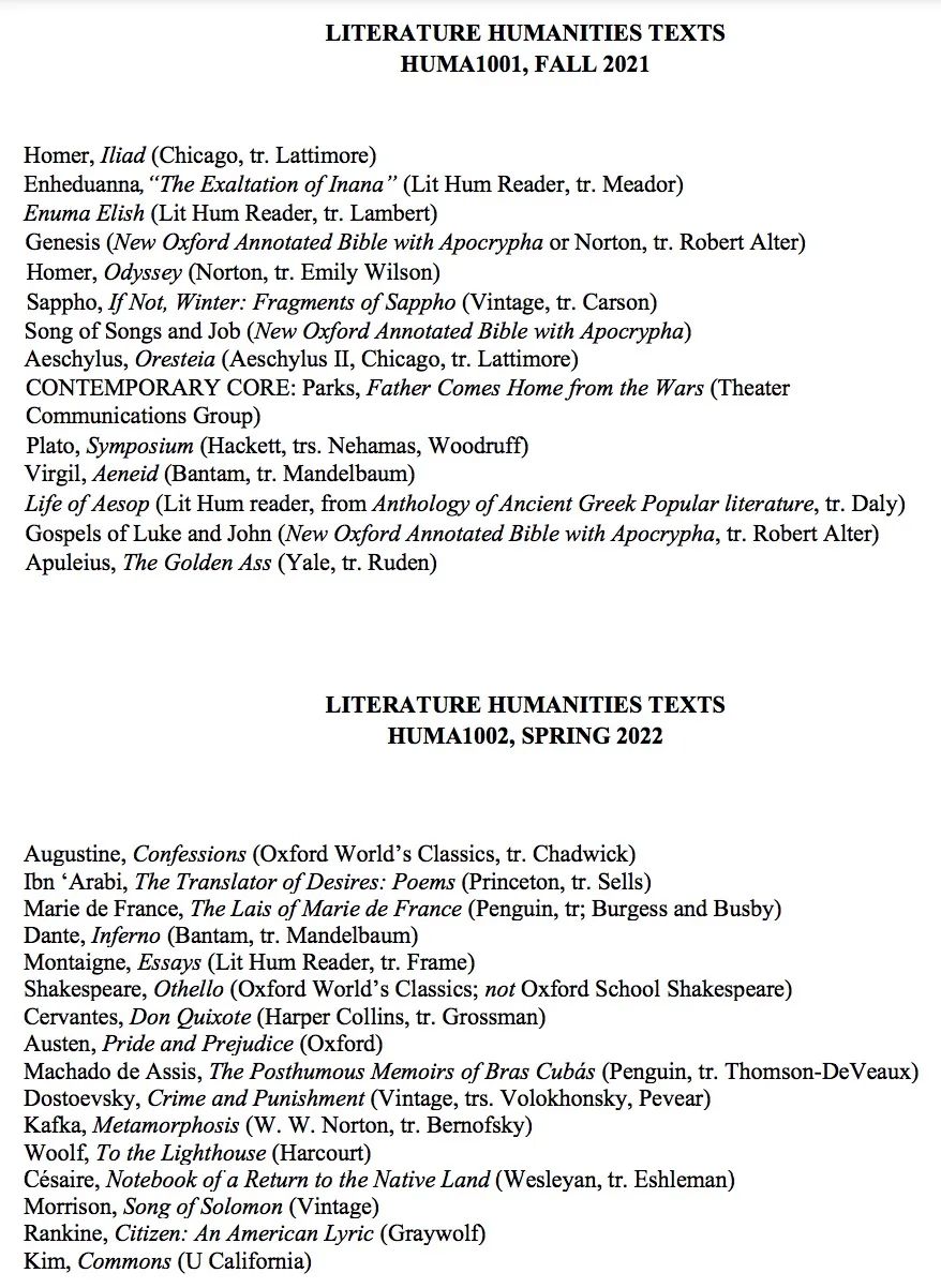 虽然在本文中没有时间涵盖所有核心课程,但以下是仅一门课程——文学人文学科的主题和工作量的一些亮点。本课程涵盖了从古希腊到现代文学的许多西方的伟大作品。这是最新的教学大纲: