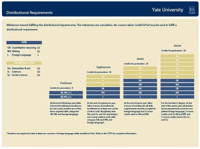 就耶鲁而言,在他们的分配要求描述中,他们声明 “这些要求是限制学生主修课程以外课程选择的唯一具体规则。分配要求本身就构成了最低限度的教育,而不是完整的教育。它们应该被视为起点,而不是目标“。