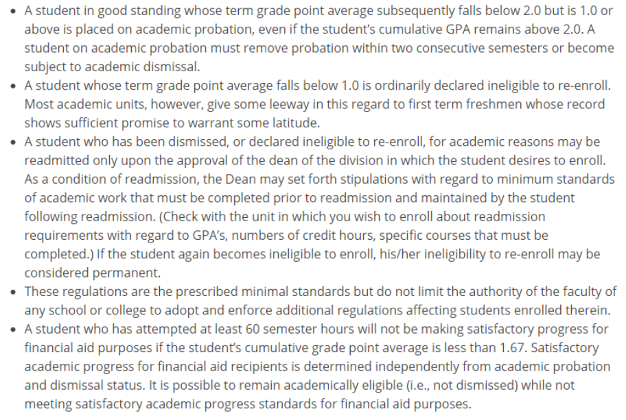 学校要求在校本科生的累积GPA不得低于2.0,如果学生的学期GPA低于2.0但是GPA大于1.0将会被学校留校察看(Academic Probation),处于留校察看状态的学生必须在之后两个学期内恢复2.0的累积GPA,否则将会被学校开除。通常,学期GPA低于1.0的学生没有资格继续入学。但是,大多数学院在新生的第一学期出现学术不达标时都会给学生一次机会。
