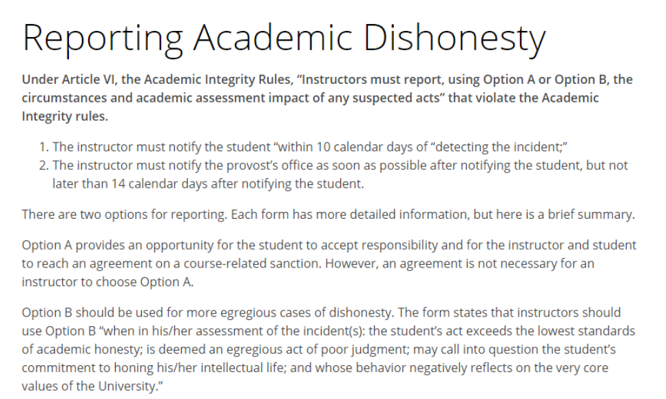 不论选择A还是B,处理决定将由学术诚信办公室或教务长办公室的代表做出(学生可能会收到留校察看,停学甚至是开除的处分),教师将评判学生在课程中获得的最高成绩。教师有权降低作业或课程成绩;课程挂科或给出课程中附加的工作等。