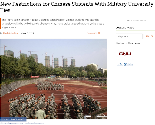 纽约时报报道,川普有可能对中国军事相关院校来的学生签证加以限制。