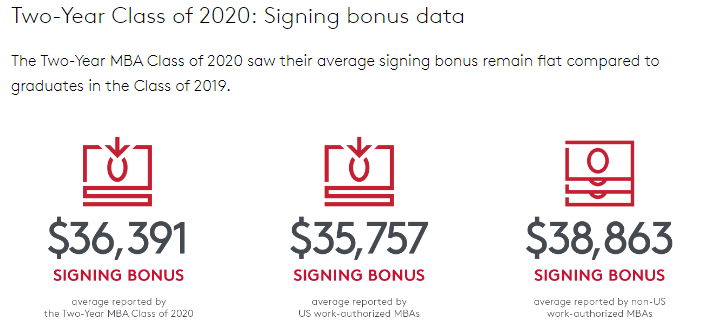 对于康奈尔大学MBA毕业生来说,最大的收获就是92%的MBA学生获得了签约奖金,我们可以大致地计算出,2020级MBA毕业生的平均总薪资为172,247美元,比去年的161,730美元增长了6.5%,与前两年相比增长了12.5%。
