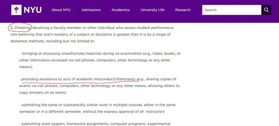 从上面截图我们就能看到,对于纽约大学来说,可以被定义为cheating的行为中,其中第二点就是协助他人进行学术不诚信,比如通过电话,电脑,或其他设施手段抄袭答案。条例是以考试为例,如果同样情形发生在作业当中,也会按此定义来查处。