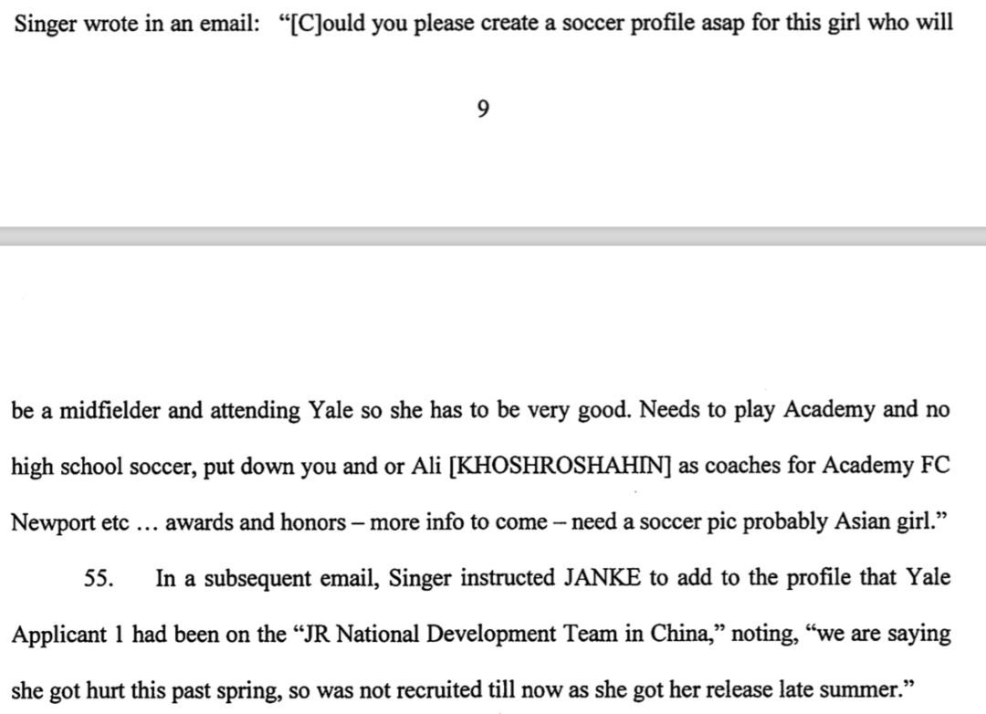 这个顾问内部邮件说,“请尽快给这个女生做一个有足球背景材料,她踢中场。因为要申请耶鲁, 所以她要特别棒。她需要参与过比较专业的俱乐部,而不是仅仅在高中队练过,就把你列成教练。再创造些奖项,越多越好- 以及一张亚洲女孩踢足球的照片。”