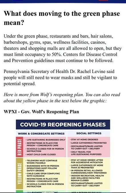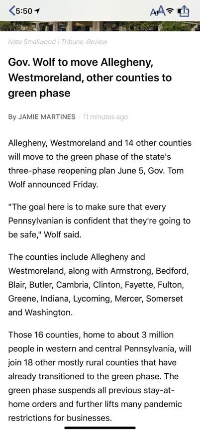 今天,宾州州长宣布,包括匹兹堡所在的阿勒基尼郡的14个郡,进入了“绿色”开放状态。
