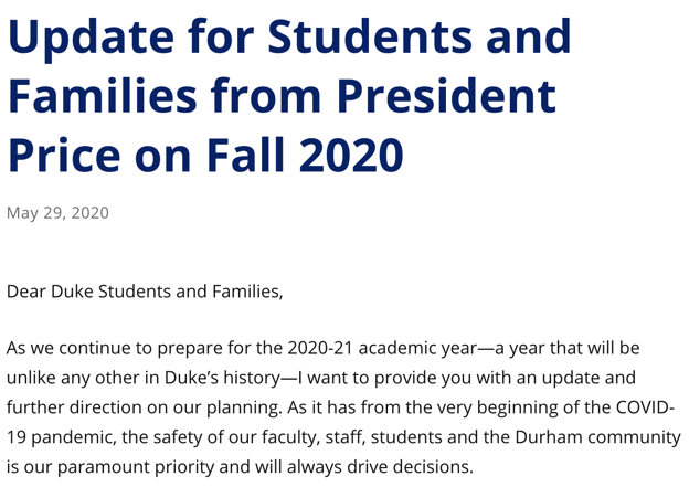 5月29日,杜克大学大学的校长,发出了给全校师生的公开信。详解讲了秋季的计划。