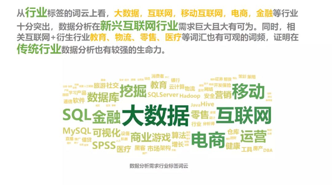 大数据时代,任何行业、任何岗位都在大量接触数据,只要公司有决策需求,就无法离开数据分析这个工具。大到世界五百强、BAT巨头、金融机构,小到创业公司。无论是互联网科技公司,还是传统行业和政府机构,都需要数据人才。在信息化时代的驱动下,各行各业都逐渐在从业务决策向数据决策转型。这点从各大企业的招聘数据中,不难发现: