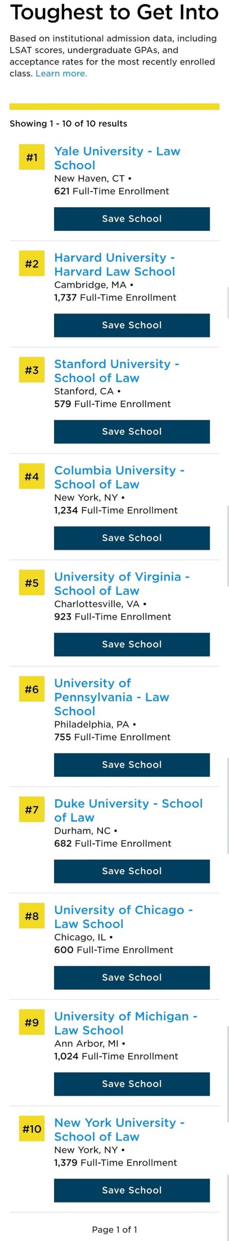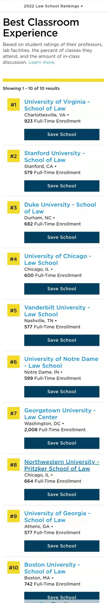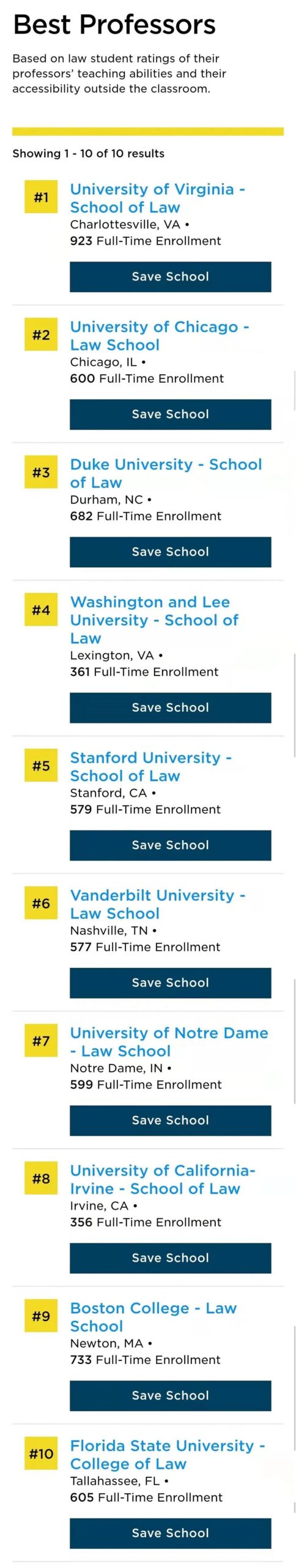弗吉尼亚大学法学院在三个排名榜中排名第一:最佳教授、最佳课堂体验和最佳生活质量。学校还列出了三个额外的榜单:最佳职业前景(排名第三)、最佳联邦职员(排名第四)和最难被录取(排名第五)。