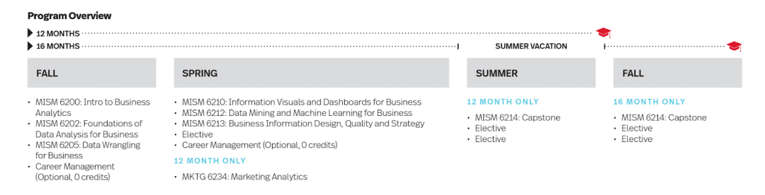该项目要求学生完成10门核心课程,全日制学生可以选择完成额外的职业管理课程,项目时长有12个月和16个月两种选择,区别在于暑期是否上课,下面是官网给出的项目时间线和课程安排: