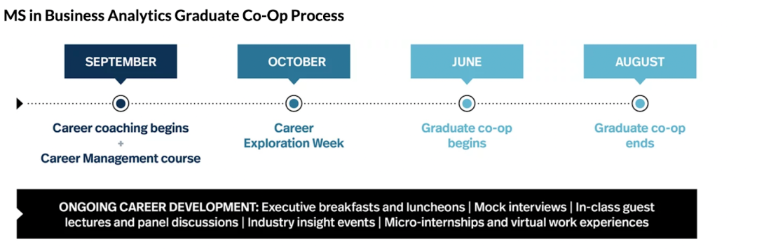 实习项目(Graduate Co-op)是项目的一大特色,学生可以参与到真实公司的复杂项目中。时长通常是8-12周(暑期),学生可以线上,线下或者混合进行。在过程中学校会持续提供就业支持,比如说模拟面试,客座教授讲座和小组讨论,行业活动,微型实习和虚拟工作体验等。下面是官网给出的时间安排: