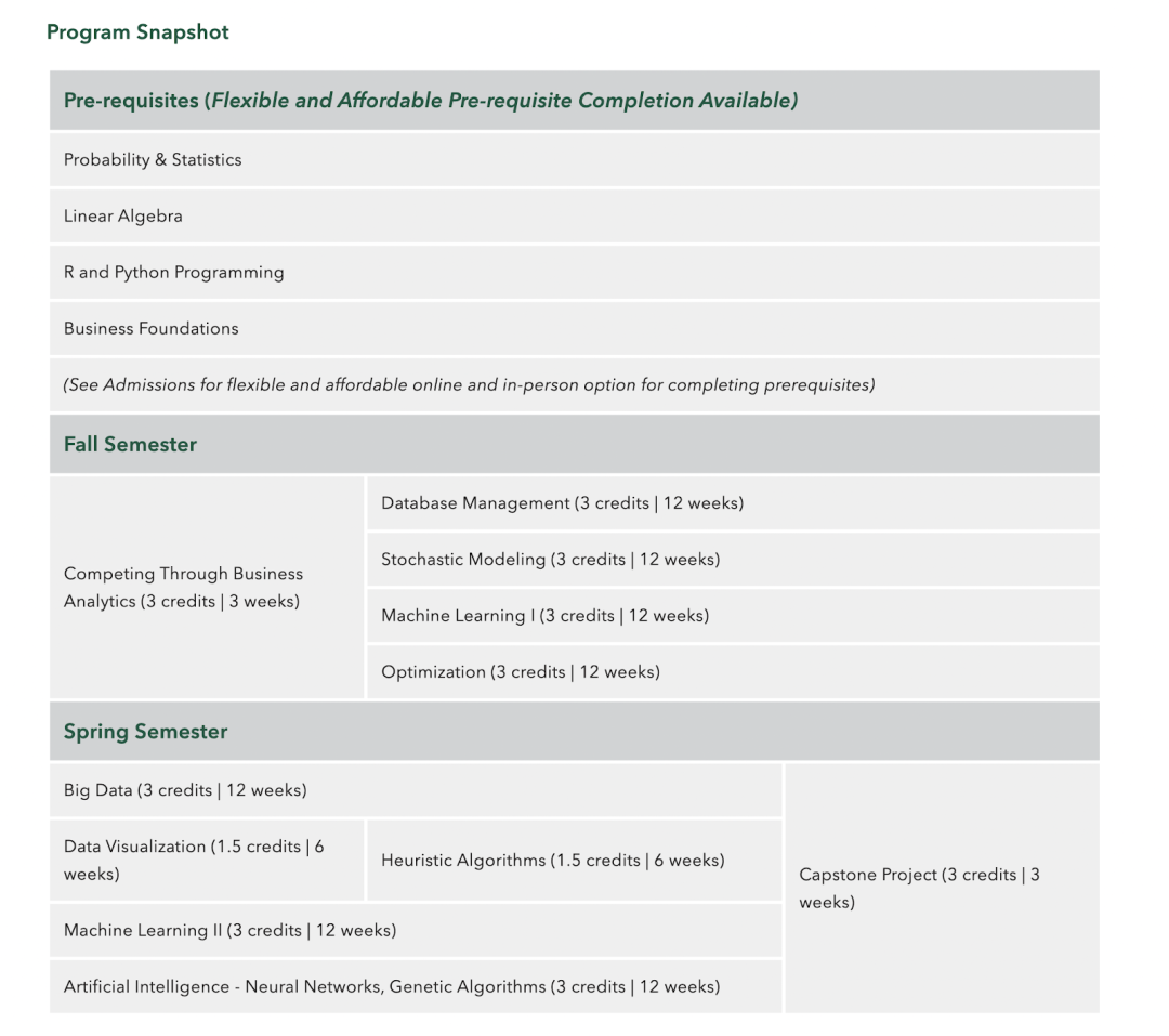 该项目时长为1年(2个学期),1/3的课程涵盖人工智能和机器学习的内容,课程的最后会以capstone项目收尾,学生将担任一家真实公司的顾问。开学前的暑假学生可以选择上训练营,内容涵盖线性代数、R 和 Python 编程。