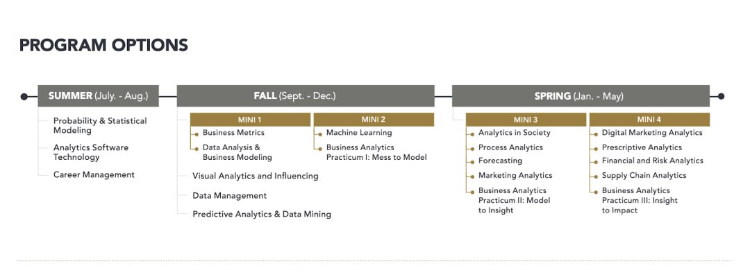 该项目时长为10个月,课程重点培养学生的分析方法和编程能力,应用在各个商业领域。学生需要在3个学期完成37个学分。第一个学期是暑期学期,最后一个学期是来年的春季学期,即5月份毕业。暑期学期开始前建议学生先参与为期5天的编程训练营,为暑期学期编程语言的全面学习做好准备,课程涵盖概率和统计建模,分析软件和职业生涯管理。秋季学期主要是长达一个学期的大课和两个小模块课程的结合,内容涵盖数据分析,商业模型,数据管理,可视化分析,机器学习等。春季学期被分成两个分开的模块,在此期间,学生将继续开发用于预测、优化和产生可操作信息的模型,并探索数据分析的多行业应用,完成三门课的团队实习并做出展示。