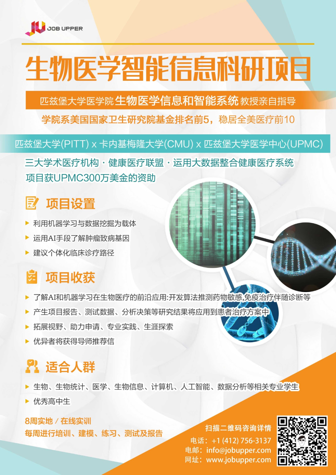 由星空官网游戏医学院-生物医学信息和智能系统教授亲自指导,获星空官网游戏医学院附属医院UPMC300万美金资助,项目致力于癌症的个性化诊疗研究。