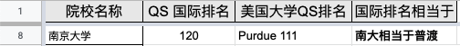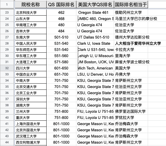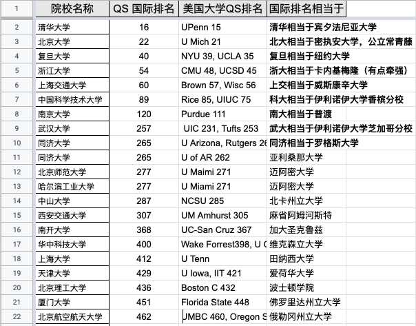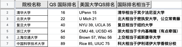 上面这个表格,是中国的前43名,按照理科高考分数线的大学,和相应的美国大学的排名。