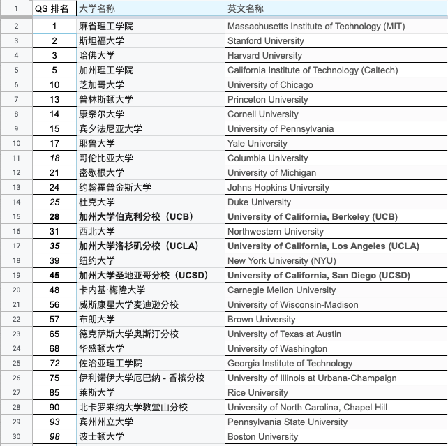在QS世界排名上,美国和中国有29所排在前100名的大学。