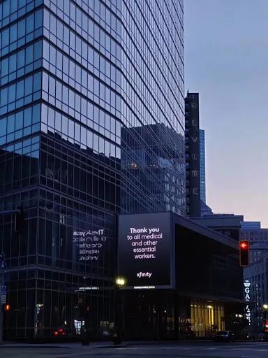大街空荡,广告牌上写着:“感谢所有医疗工作者和其他提供服务的人。”