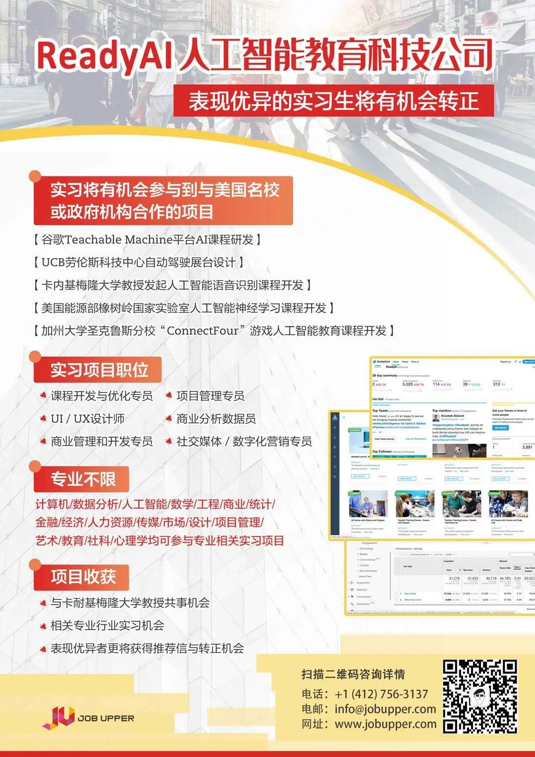ReadyAI目前在招实习生,也在招实训生。专业包括计算机,数据分析,市场,教育,心理学,认知学,都可以。