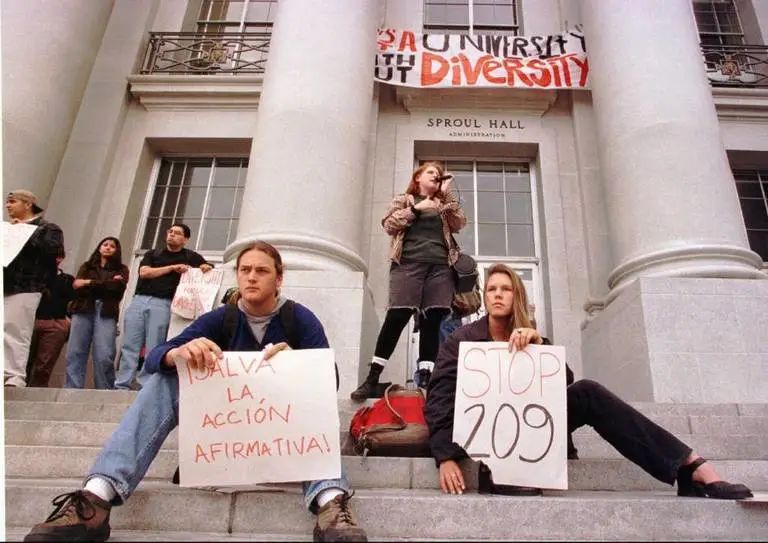 这是当年加大伯克利的白人学生,声援阻止多给少数民族名额的法案。在这个问题上,白人和亚裔是一个战壕里的,因为多给黑人和西班牙裔名额,势必就要减少白人和亚裔的名额。