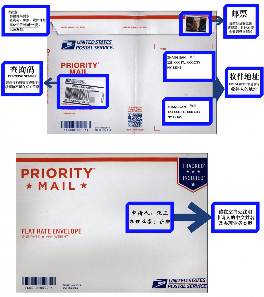4) 把包括回邮信封在内的第二大项中提到的9个材料放进一个新的USPS PRIORITY MAIL信封里,邮寄到大使馆/总领馆邮件里提供的地址。邮寄材料时信封上请一定醒目地用中文注明“ x 月 x 日护照申请材料”!(请务必完整填写邮寄地址并作标识,否则邮件可能会被拒收!)