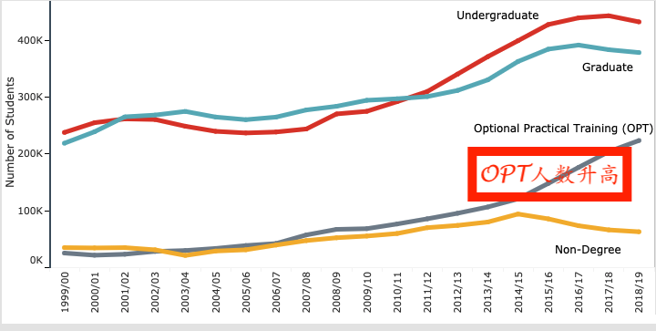 可以看到,虽然红线本科学生,蓝线研究生学生,黄线非学位学生的人数,从2017年都开始下降,但是OPT人数,这条棕色曲线,却在一直上升。
