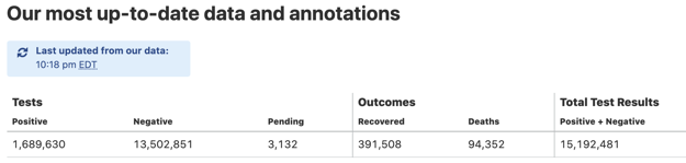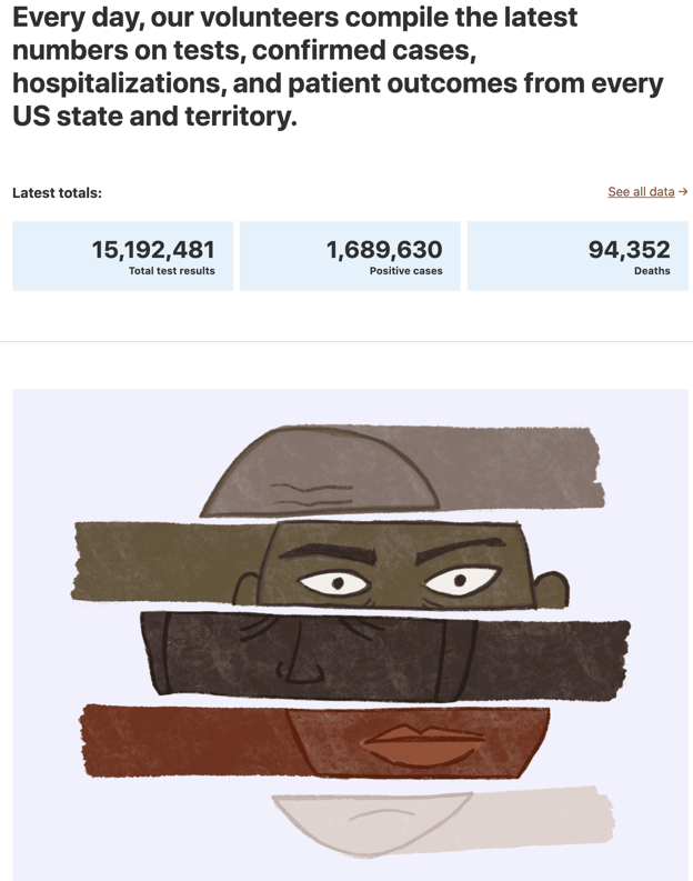 今天的数据来自冠状病毒跟踪项目,网站在https://covidtracking.com/data。