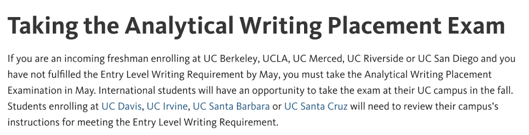 因为英语写作能力对于能够成功学习很多课程都很重要,所以学生必须在入学之前或者是大学第一年达到Entry Level Writing requirement入门级写作要求。每个学生的情况不同,具体是否满足要求,可以在学校官网搜索“entry level writing requirement”来了解,或者可以在学术顾问一对一约谈时请顾问老师帮忙确认。如果没有满足要求,则需要在网上进行预约,通过考试以后才能选择相应课程。