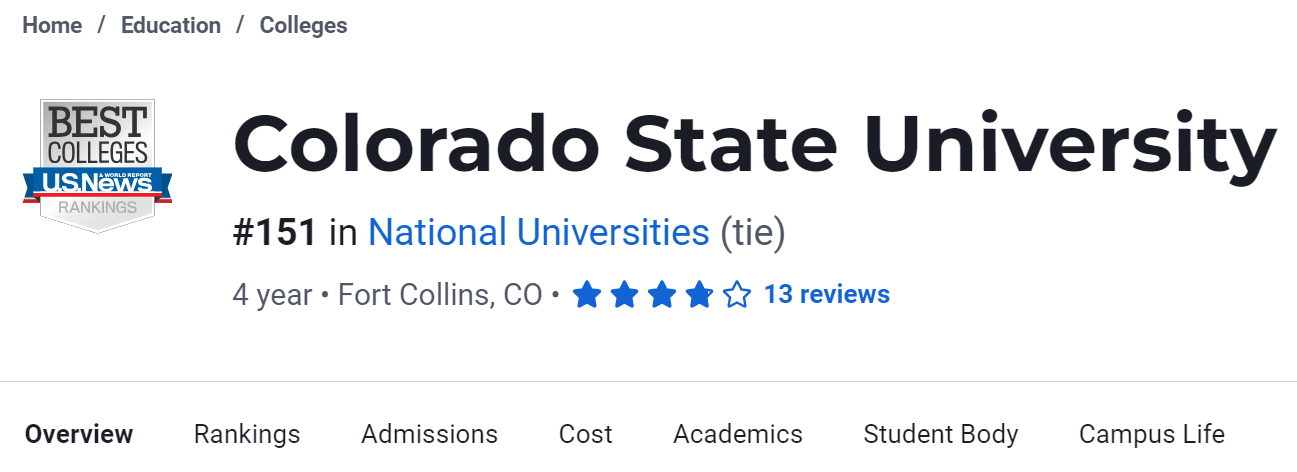 科罗拉多州立大学 (Colorado State University,简称CSU)是一所四年制公立大学,成立于1870年,位于科罗拉多州柯林斯堡,地处洛杉矶山麓,风景怡人,学校距离科罗拉多州第一大城市丹佛一个小时车程。大学前身是一所农科学院,其农业科学学院在美国处于前沿地位,最著名的是兽医学,是全州的佼佼者。