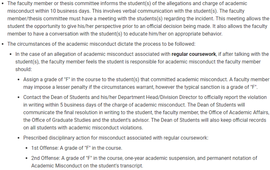 在发现学生有学术不诚信行为后,教师或Thesis Committee在10个工作日内将通知学生,指明对学生的指控,其中涉及与学生的口头交流。学生在被怀疑有学术不诚信行为后,需要与教师/委员会进行会面,陈述自己的观点或解释澄清自己的行为,教师也可以与学生进行对话,提高相应的教育。