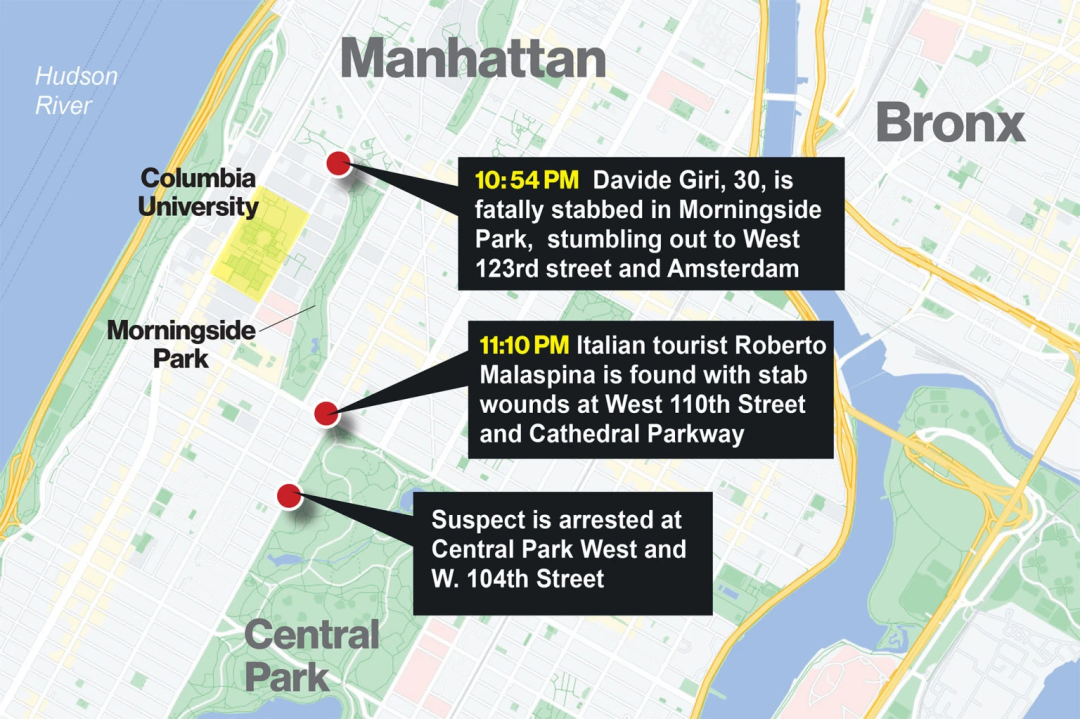 从地图中可以看出,Davide Giri的受害地点,距离哥伦比亚大学校园仅仅三个街区。