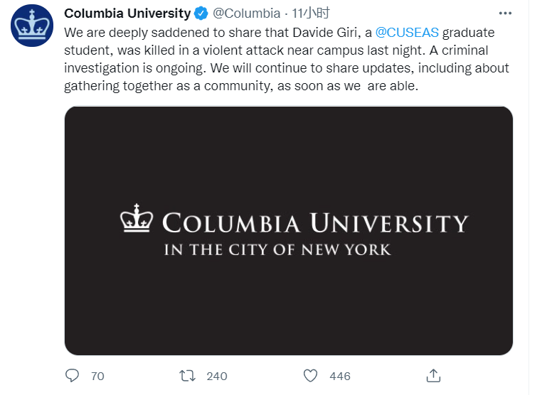 哥伦比亚大学官方也在推特上发布讣告,确认Giri遇害,并表示将根据此后案件调查进度更新相关信息。