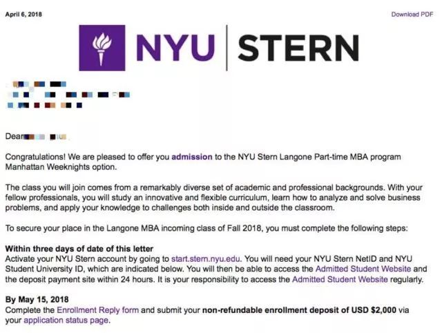最终W同学赢得了Dream School的青睐!顺利拿到纽约大学商学院的offer!