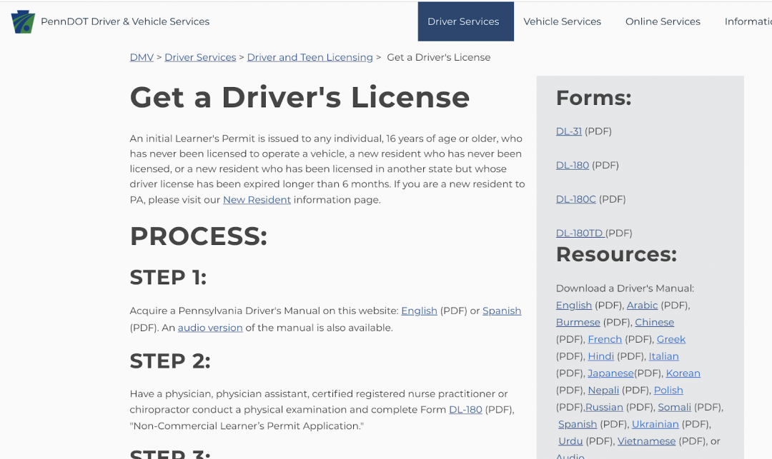 (网站为:https://www.dmv.pa.gov/Driver-Services/Driver-Licensing/Pages/get-driver-license.aspx)