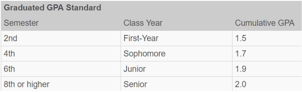 (以下学期指春季或秋季,不包括夏季)某个学期GPA低于2.0,则进入警告状态;连续两个学期GPA低于2.0,留校察看处分;春季学期之后,按照总GPA决定是否停学或开除。GPA的要求如下: