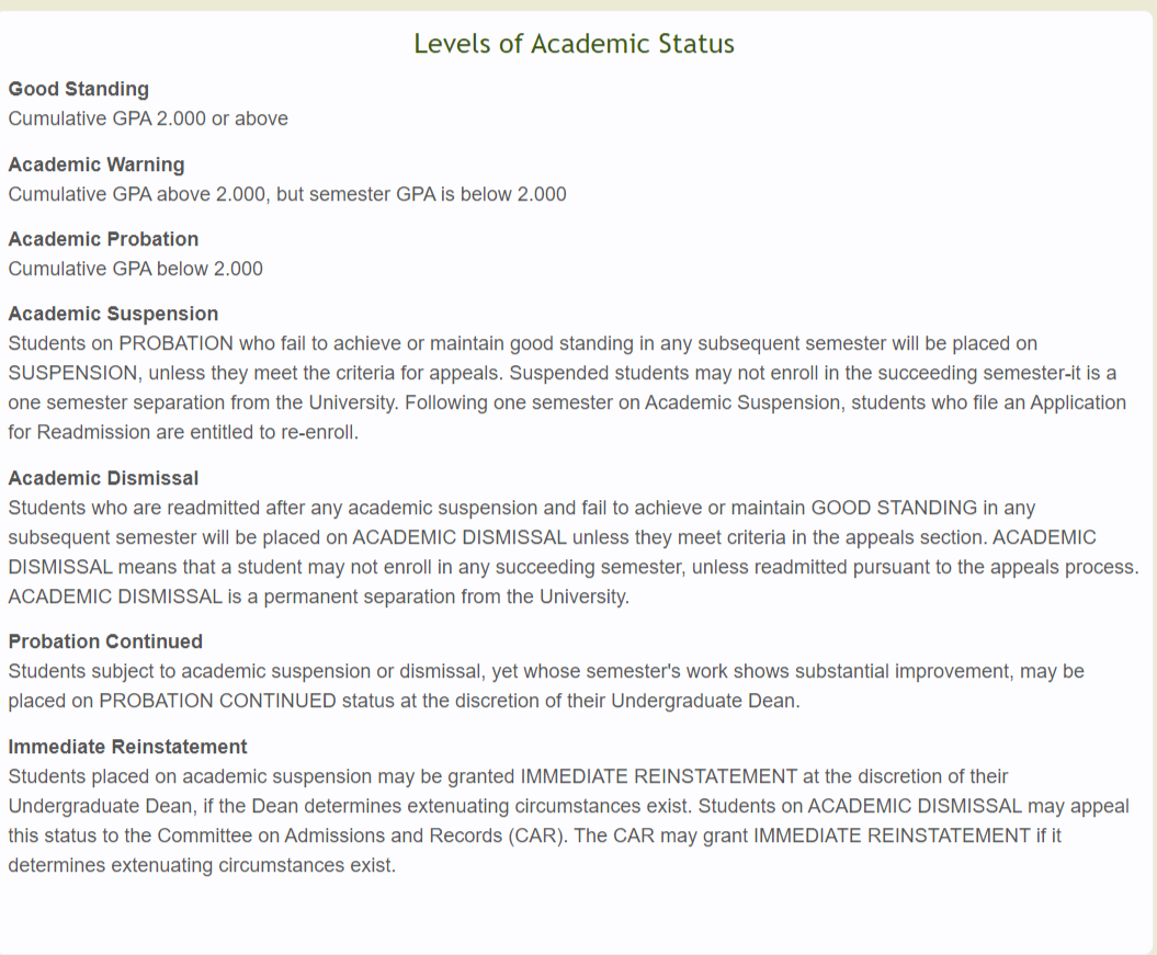 UMass对学生学术状态的划分,基本可以分为Good Standing, Academic Warning, Academic Probation, Academic Probation, Academic Dismissal等。