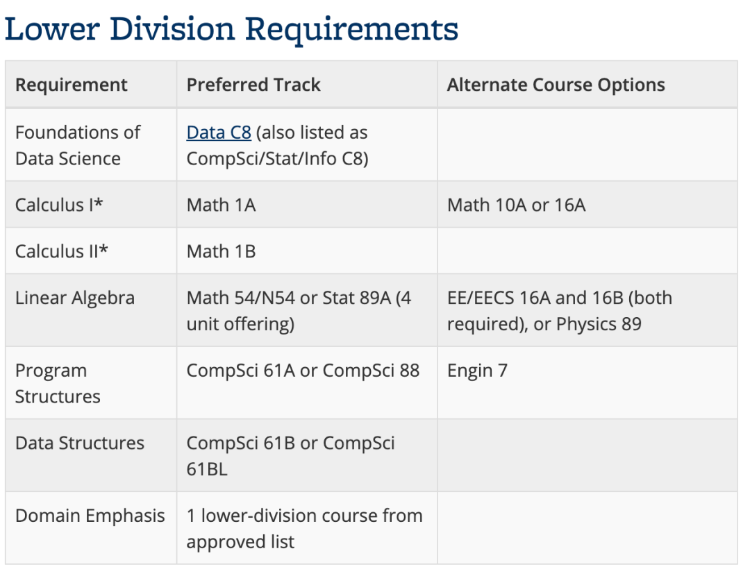 - Computational & Inferential Depth 计算和推理深度:学生必须从高级课程列表中选择两门(7个学分以上)课程,这些课程提供了数据100和低年级课程的计算和推理深度(C&ID)