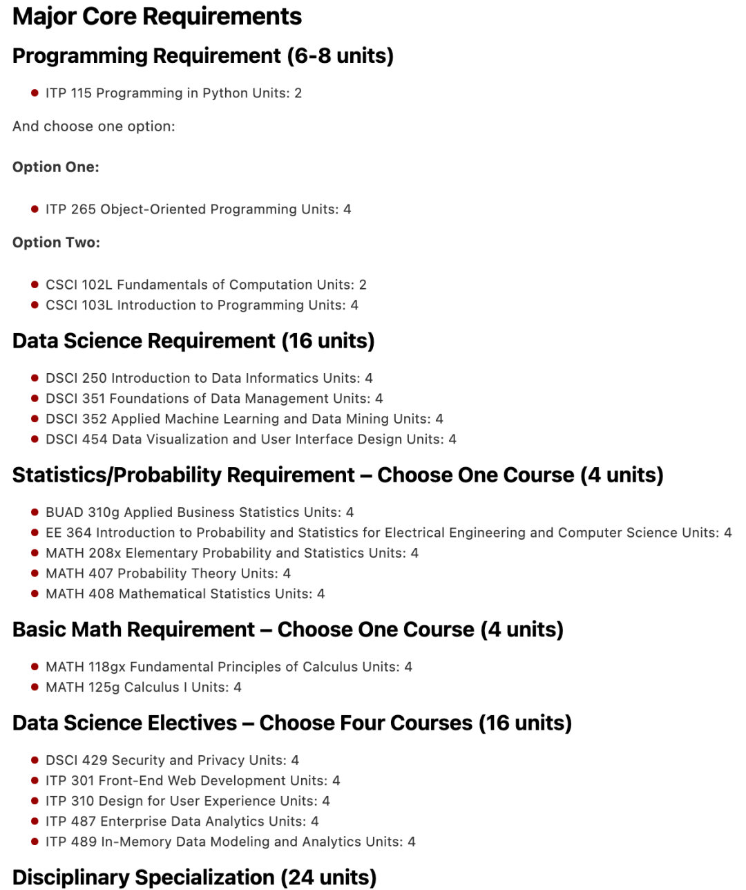 数据科学文学士是一个合作学位项目,由南加州大学文学、艺术和科学学院和南加州大学维特比工程学院共同开设。学生完成128个学分,包括文学、艺术和科学学院至少70个学分的课程和维特比工程学院至少38个学分的课程。在维特比学院完成的课程包括基本编程和数据科学要求,而在文学、艺术和科学学院学院完成普通教育和写作要求的课程。