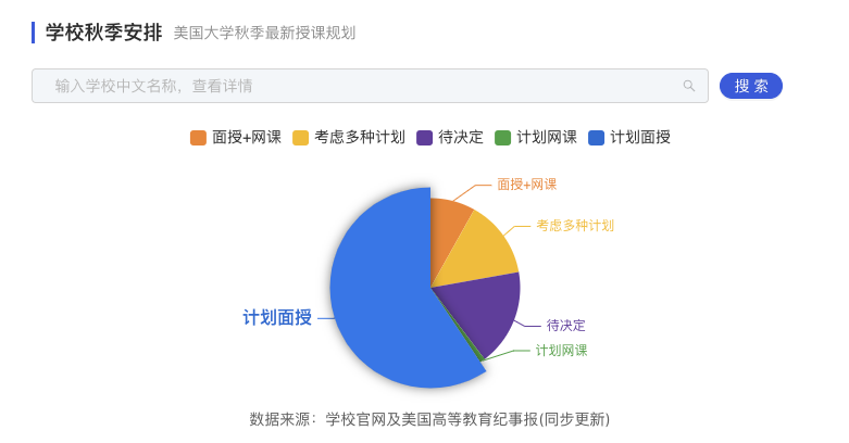 根据美国高等教育纪事报Chronicle以及各学校官网的最新通知,关于秋季学期的安排,提交方案的320所高校中,有60%的学校计划面授,22%的学校考虑面授+网课或多种计划,17.5%的学校尚未决定,仅有1%的学校计划全部网课。